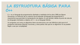 El documento describe la estructura básica de un programa en C++. Explica que un programa en C++ debe incluir cabeceras, la función principal "main", y las sentencias de código dentro de llaves. También detalla cada parte como las librerías, parámetros de la función main, y que el programa termina cuando se cierra la función main.