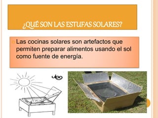 Este documento describe diferentes tipos de estufas solares caseras, incluyendo estufas parabólicas, de vapor, de caja y horno, y de embudo. Explica los materiales y pasos necesarios para construir una estufa solar tipo caja, así como instrucciones para cocinar comida utilizando el sol como fuente de energía. Algunos factores que afectan la velocidad de cocción incluyen la hora del día, la cantidad de sol y viento, y el grosor y contenido de la olla.