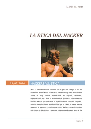 Este documento discute la ética de los hackers. Explica que aunque los hackers a menudo son malinterpretados como piratas informáticos, en realidad son personas con amplios conocimientos técnicos que disfrutan explorando y mejorando sistemas. Distingue entre hackers, que buscan el conocimiento, y crackers, que usan sus habilidades con fines delictivos. También analiza problemas éticos emergentes relacionados con la privacidad, la propiedad y el acceso en la era digital.