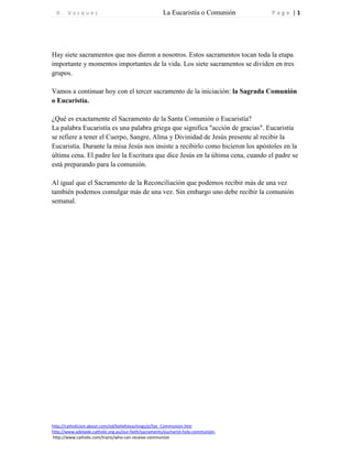 Este documento describe el sacramento católico de la Eucaristía o Comunión. Explica que durante la misa, los católicos creen que reciben el cuerpo, la sangre, el alma y la divinidad de Jesús. También describe los símbolos de la Eucaristía como el pan y el vino, y los efectos espirituales y físicos de recibir la comunión.