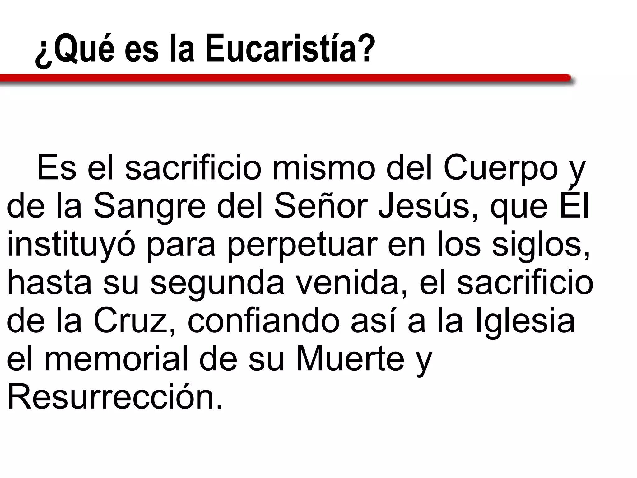 La Eucaristía es el sacrificio del Cuerpo y la Sangre de Jesús que instituyó en la Última Cena para perpetuar el sacrificio de la Cruz. Jesús quiso que la Iglesia celebrara la Eucaristía como memorial de su Muerte y Resurrección, renovando incruentamente el sacrificio del Calvario. La Eucaristía es también el corazón y la cumbre de la vida de la Iglesia.