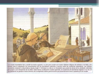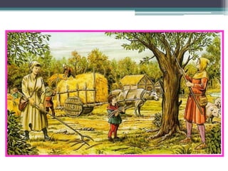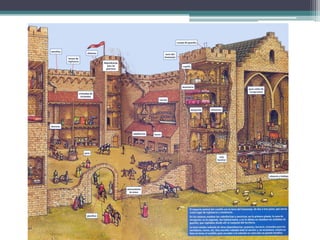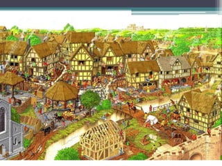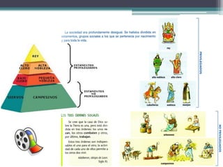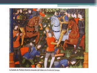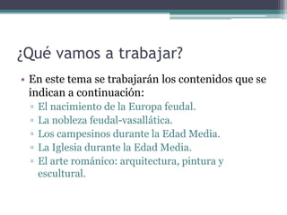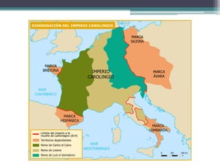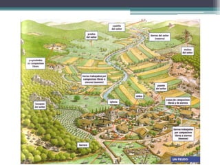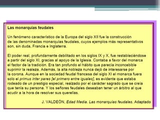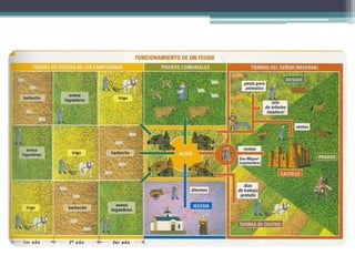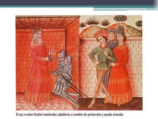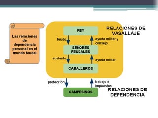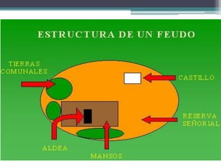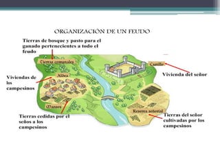 El documento resume los principales aspectos de la Europa feudal. Tras la fragmentación del Imperio Carolingio en el siglo IX, los monarcas entregaban tierras a nobles y eclesiásticos a cambio de su lealtad y protección, dando lugar al sistema feudal. La nobleza gobernaba las tierras y a los campesinos, que constituían la gran mayoría de la población pero tenían pocos derechos. El feudalismo marcó la organización política, económica y social de Europa durante la Edad Media.