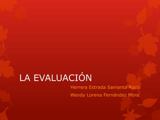 La evaluación se debe realizar para valorar el grado de consecución de los objetivos de aprendizaje por parte de los alumnos. Se evalúa principalmente a los alumnos y sus aprendizajes, pero también se puede evaluar al grupo clase, profesor y equipo docente. La evaluación debe centrarse en los alumnos, sus aprendizajes académicos y desarrollo de capacidades. Debe ser un proceso formativo que incluya evaluaciones inicial, reguladora, final e integradora para mejorar continuamente el proceso de enseñanza-aprend