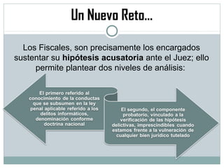 El documento aborda el desafío que representa la evidencia digital para los fiscales, destacando la importancia de la informática jurídica y su impacto en la criminalidad actual. Se menciona la evolución de los delitos informáticos y la necesidad de una adecuada recolección y análisis de evidencias digitales para su utilización en juicios. Asimismo, se enfatiza la relevancia de la informática forense en la investigación de delitos y los requisitos que deben cumplir los investigadores en este ámbito.