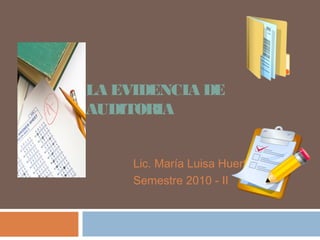 La evidencia de auditoría se refiere a la información obtenida por el auditor durante la realización de pruebas. Esta evidencia debe ser suficiente en cantidad y competente/adecuada en calidad para ser concluyente. Existen dos tipos de evidencia: física u observacional, y documental o escrita. La evidencia documental puede provenir de fuera o dentro de la empresa auditada, siendo la externa más confiable y la interna de menor calidad, excepto los cheques bancarios.