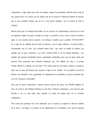 Este documento resume varias teorías sobre la evolución humana, incluidas las teorías de Darwin sobre la selección natural, la teoría del diluvio, y la teoría del uniformismo. Explica que mientras estas teorías ayudan a entender la adaptación, la verdadera "evolución" requeriría millones de años de cambios más drásticos. El autor concluye que aunque no puede afirmar con certeza que la teoría de Darwin sea correcta, actualmente es la explicación más valida disponible.