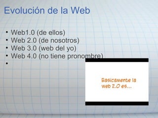 El documento describe la evolución de la Web a través de cuatro generaciones: Web 1.0 permitía solo lectura de contenido, Web 2.0 permitió interacción e intercambio de contenido entre usuarios, Web 3.0 busca hacer contenido accesible a través de múltiples aplicaciones y usar inteligencia artificial, y Web 4.0 aún no tiene una definición clara.