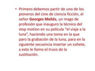 Este documento resume la evolución histórica de la técnica del stop motion. Comienza con los pioneros como Georges Meliés y su uso del stop motion en la película "Viaje a la Luna". Luego, la técnica fue desarrollada usando tizas y caricaturas, y avanzó con películas como "El hotel encantado" que mostraba objetos cortados en rebanadas de forma stop motion. Figuras importantes en el desarrollo del stop motion fueron Emille Cohl y Wladyslaw Starewicz. La técnica continuó evol
