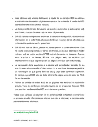 El documento describe las ventajas de los RSS para recibir actualizaciones de páginas web favoritas de forma automática y sin visitar cada página individualmente. Los RSS permiten a los lectores mantenerse informados sobre las novedades de las páginas web de su interés de manera gratuita y ahorrando tiempo, ya que la información se actualiza y almacena en un solo lugar.