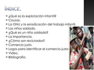 El documento trata sobre la explotación infantil, incluyendo sus causas como la pobreza y los conflictos armados. También habla sobre los esfuerzos de la ONU para erradicar el trabajo infantil y sobre los niños soldados, como son reclutados y la importancia de prevenir esto. Finalmente, menciona el comercio justo como una alternativa que ofrece mejores condiciones a los trabajadores.