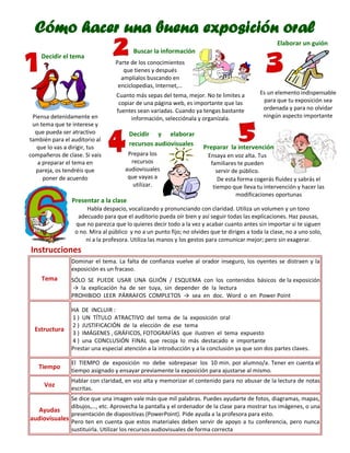 Este documento ofrece pautas para realizar una exposición oral efectiva. Explica que una exposición oral implica hablar ante un público de manera clara y con gestos adecuados. Se recomienda elaborar un guión con los puntos principales y estructurar la exposición con una introducción, desarrollo y conclusión. También es importante controlar el tiempo, hablar de forma entendible y usar recursos audiovisuales de apoyo sin depender de ellos.