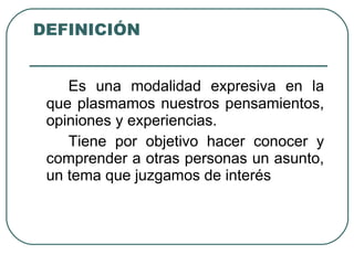 Este documento define la exposición oral como una modalidad expresiva para compartir pensamientos y opiniones con otros. Explica que una exposición oral puede ser un informe, una conferencia o un discurso, y que sus objetivos pueden ser informar, convencer, persuadir u entretener. Finalmente, detalla las partes, estructuras y cualidades clave de una buena exposición oral.