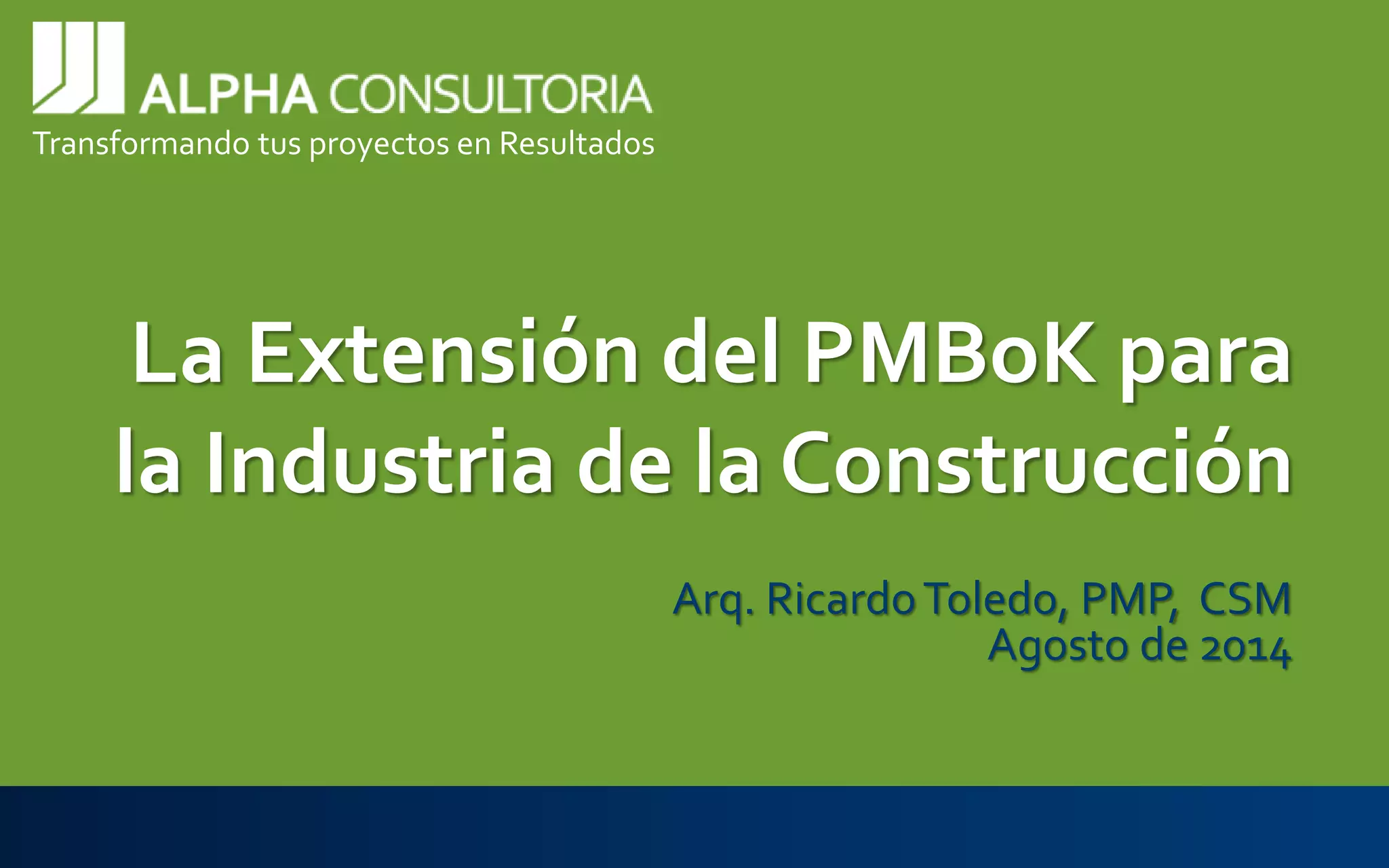 El documento detalla la extensión del PMBOK para la industria de la construcción, destacando sus características e implementación en proyectos específicos. Se presentan nuevas áreas de conocimiento y procesos que abordan la gestión de seguridad, ambiental, financiera y de reclamaciones, así como la integración de herramientas específicas para la industria. Se enfatiza la importancia de estas adiciones y modificaciones para una gestión eficaz de proyectos de construcción.