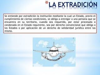 La extradición es el proceso mediante el cual un Estado entrega a una persona que se encuentra en su territorio a pedido de otro Estado, cuando esa persona está siendo procesada o condenada en el Estado requirente. Existen dos tipos de extradición: activa, cuando Venezuela solicita a otro Estado la entrega de una persona, y pasiva, cuando otro Estado solicita a Venezuela la entrega de una persona. La extradición sigue unos principios como la no entrega de nacionales, la denegación de la extradición en caso de pena de muerte, y que el delito debe