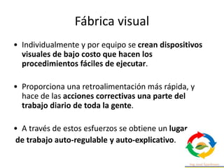 Este documento describe los principios y herramientas de la fabricación visual en la manufactura esbelta. Explica cómo los dispositivos visuales de bajo costo permiten procesos fáciles de ejecutar y retroalimentación rápida para acciones correctivas diarias. También describe varias herramientas visuales como ANDON, Jidoka, Kanban y tableros de información que permiten monitorear procesos, comunicar condiciones y tomar acciones rápidas. El objetivo general es lograr un lugar de trabajo auto-explicativo y auto-reg