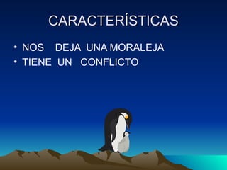 La fábula tiene personajes que son animales personificados que actúan como seres humanos y deja una moraleja. Presenta un conflicto en un marco de lugar y tiempo.