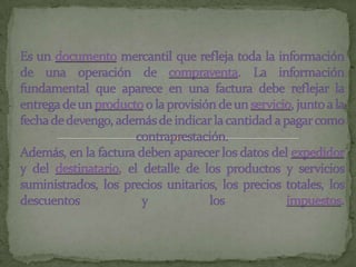La factura es un documento mercantil que refleja los detalles de una transacción comercial, incluyendo la fecha, productos o servicios, precios, impuestos y datos de las partes involucradas. Es importante para sustentar gastos tributarios, aduaneros y demostrar propiedad de productos. Debe contener información específica legalmente requerida.