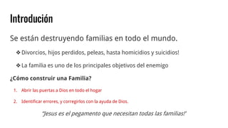El documento aborda la importancia de construir familias sólidas basadas en principios cristianos, destacando que Cristo es el fundamento esencial. Se presentan siete principios para fortalecer la familia, incluyendo la priorización de Dios, la comunicación efectiva y la necesidad de luchar por la unidad familiar. Se enfatiza que el amor y la humildad son cruciales para enfrentar los desafíos que enfrentan las familias en la actualidad.