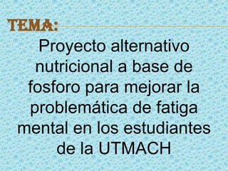 Este documento propone un proyecto para crear un jarabe a base de productos naturales como nueces para reducir los altos niveles de fatiga mental en estudiantes. El objetivo general es aportar una alternativa nutricional para reducir el estrés y la falta de descanso. Los objetivos específicos son ayudar a los estudiantes de la UTMACH que tienen problemas de rendimiento académico debido a la fatiga mental. El jarabe se elaborará con una infusión de nueces, agua y azúcar para mejorar la nutrición y reducir