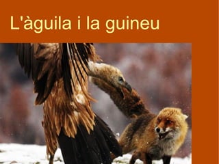 El documento presenta varias fábulas que utilizan animales para transmitir lecciones morales. La primera fábula trata sobre una águila y una zorra que eran amigas hasta que el águila mata a los cachorros de la zorra por hambre. Más tarde, la zorra se venga cuando el águila cae en un fuego. Otra fábula compara el poder del viento frío frente al calor del sol. Una tortuga le gana una carrera a una liebre por ir más lento pero constante.