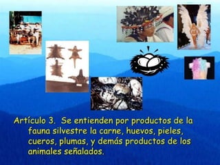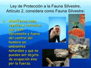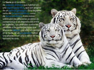 La fauna se refiere al conjunto de especies animales que habitan una región geográfica o período geológico. Depende de factores abióticos como bióticos, incluyendo las relaciones de competencia o depredación entre especies. Los animales son sensibles a perturbaciones en su hábitat. La fauna se divide en silvestre u original de la región, y en proceso de domesticación a través de cría en cautiverio para volverse doméstica.
