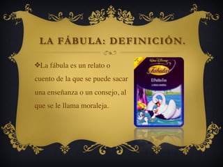 La fábula se define como un relato breve que suele presentar animales u objetos humanizados y termina con una moraleja o enseñanza. Posee una estructura sencilla que incluye una situación inicial, un problema planteado y una moraleja final. Los temas tratados suelen ser vicios humanos como la arrogancia, mentira y avaricia, y detrás de cada fábula hay una crítica hacia ciertos comportamientos.