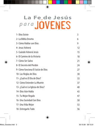 Este documento presenta varios capítulos sobre temas religiosos cristianos. El primer capítulo trata sobre la existencia de Dios y argumenta que los detalles precisos del universo y la vida en la Tierra demuestran que Dios existe y cuida de la humanidad. El segundo capítulo habla sobre la Biblia como la carta que Dios escribió para la humanidad. El tercer capítulo enseña sobre la importancia de la oración como una forma de comunicación con Dios.
