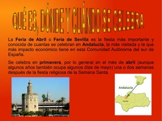 La Feria de Abril de Sevilla es la fiesta más importante de Andalucía, celebrándose generalmente en abril y durando una semana. Incluye casetas decoradas, comidas típicas andaluzas, vestimenta tradicional y actividades como el baile y cante de sevillanas. Además, se llevan a cabo corridas de toros en la Plaza de Toros de la Real Maestranza.