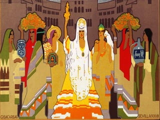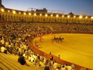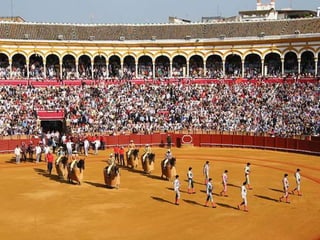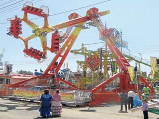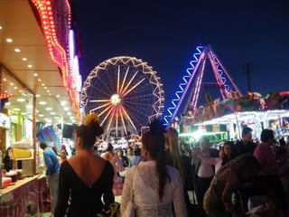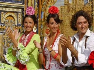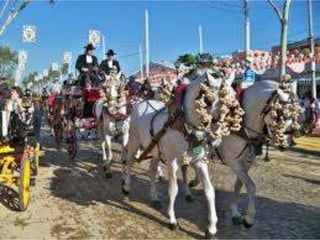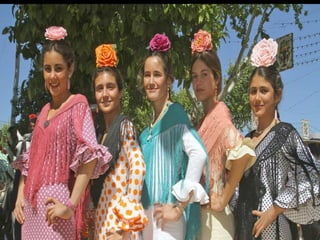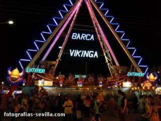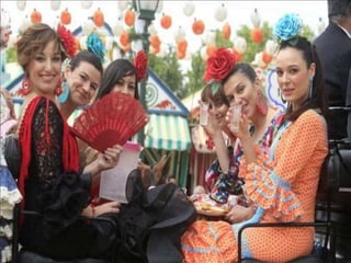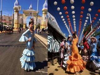 La Feria de Sevilla es una fiesta local que se celebra cada año en abril en el barrio de Los Remedios de Sevilla. Comenzó en 1847 como una feria de ganado y ha evolucionado para incluir casetas, comida, bebida y atracciones. Actualmente cuenta con más de 1000 casetas privadas y públicas, calles decoradas con farolillos y nombres de toreros, y atrae a cientos de miles de visitantes cada año para disfrutar de la comida, la música, el baile y la tradición de esta popular fer