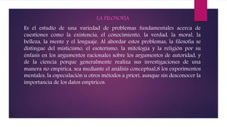 El documento presenta una introducción a la filosofía, describiendo su enfoque en problemas fundamentales como la existencia y el conocimiento. Luego resume las principales épocas de la filosofía, incluyendo la filosofía griega antigua con figuras como Tales de Mileto, Platón y Sócrates, la filosofía medieval, la filosofía renacentista y la filosofía moderna. Finalmente, enumera algunas de las ramas principales de la filosofía y brinda breves biografías de tres de los mayores filósofos de la ant