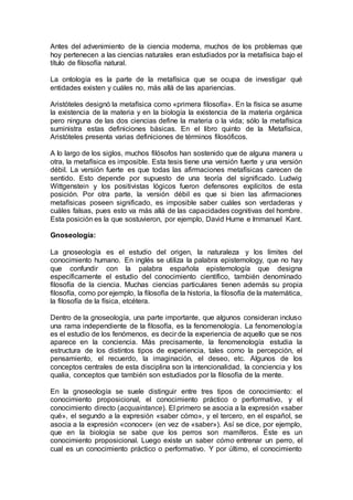La filosofía es el estudio de problemas fundamentales sobre cuestiones como la existencia, el conocimiento, la verdad, la moral y el lenguaje. Se distingue de otras disciplinas como la religión y la ciencia por su énfasis en los argumentos racionales. Sus principales ramas son la metafísica, que estudia la naturaleza de la realidad; la gnoseología, que estudia el origen y los límites del conocimiento humano; la lógica, que estudia la inferencia válida; y la ética, que estudia conceptos como la moral