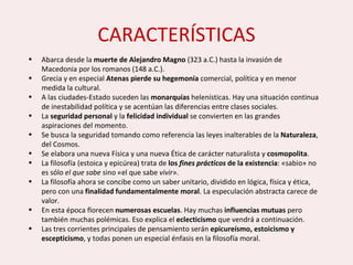 Este documento describe las características de la filosofía helenística, que abarca desde la muerte de Alejandro Magno hasta la invasión romana. Durante este periodo florecieron numerosas escuelas filosóficas como el epicureísmo, estoicismo y escepticismo, que pusieron énfasis en la filosofía moral y enseñaron que la felicidad se alcanza a través de la virtud y la imperturbabilidad del alma. La filosofía ahora se concibe como un saber unitario dividido en ló