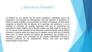 El documento define la filosofía como una ciencia que busca responder interrogantes sobre la existencia, la mente, la moral y otros temas a través de evidencias racionales en lugar de argumentos de autoridad. Explica que la filosofía surgió en la antigua Grecia como una forma de explicar fenómenos naturales de manera racional más que mítica. También resume las principales ramas de la filosofía e introduce brevemente a filósofos importantes como Aristóteles, Platón, Sócrates y Heráclito.