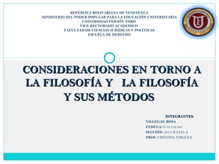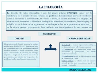 La filosofía es el estudio de problemas fundamentales sobre cuestiones como la existencia, el conocimiento, la verdad, la moral y el lenguaje utilizando argumentos racionales en lugar de la autoridad o la evidencia empírica. Se caracteriza por ser racional, sistemática y tener un sentido crítico. Surge en Grecia en el siglo VI a.C. cuando el pensamiento pasa de lo mítico a lo racional. Incluye ramas como la metafísica, la ética, la gnoseología y la lógica. Los principales métodos filosó