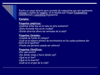 El documento presenta una introducción a la filosofía, describiendo sus diferentes tipos de preguntas (empíricas, formales y filosóficas) y los enfoques de Platón, Aristóteles, Locke y Descartes para abordar cuestiones metafísicas y epistemológicas. Platón propuso que existen un mundo sensible de apariencias y un mundo inteligible de ideas reales, mientras que Aristóteles argumentó que lo real es lo físico y que todo cambio se explica por la materia y la forma. Locke sostuvo que el