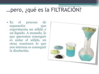 La filtración es un proceso de separación de sólidos y líquidos que puede realizarse mediante diferentes métodos, incluyendo por gravedad, presión reducida y utilizando placas filtrantes. La filtración por gravedad utiliza embudos y papeles de filtro, mientras que la filtración por presión reducida es más rápida y requiere un equipo conectado a una fuente de vacío. Adicionalmente, la filtración con celita se emplea para suspensiones coloidales y sólidos finos, reteniendo impurezas que otros filtros no pueden gestionar.