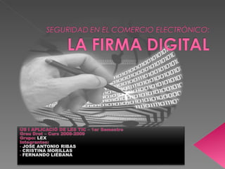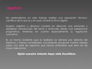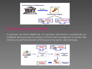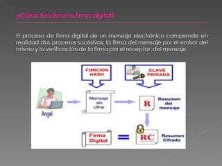 El documento introduce el tema de la firma digital de forma pragmática, teniendo en cuenta su regulación normativa. Explica que la firma digital es una secuencia de datos electrónicos obtenida mediante un algoritmo de clave pública que identifica al remitente y garantiza la integridad, autenticidad y no repudio del mensaje. También aborda cuestiones como las funciones hash, sellos temporales y confidencialidad, así como los procesos para obtener una firma digital válida.