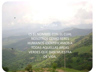 El documento habla sobre la importancia de la flora para los seres humanos. Explica que las plantas llevan a cabo el proceso vital de la fotosíntesis para producir oxígeno a partir de bióxido de carbono, y que necesitan agua para sobrevivir y seguir produciendo el oxígeno que respiramos. Concluye enfatizando la necesidad de conservar los factores que hacen posible la vida de las plantas, como el agua, para asegurar nuestra propia supervivencia.