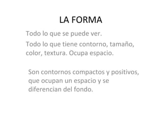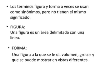 El documento describe las formas y figuras desde diferentes perspectivas. Explica que una forma es un objeto tridimensional que ocupa espacio, mientras que una figura es bidimensional y delimitada por líneas. Luego detalla diversas técnicas para visualizar formas mediante líneas, superficies, puntos y texturas. Distingue entre formas figurativas (naturales y artificiales) y abstractas, e incluye ejemplos de tipos de figuras caligráficas, orgánicas y geométricas. Finalmente, propone actividades pr