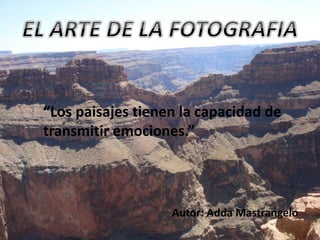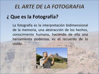 La fotografía es una representación bidimensional de la memoria y los recuerdos. Su historia comienza oficialmente en 1839 con el daguerrotipo. La fotografía nos ayuda a conocer el mundo distante y preservar nuestras experiencias. Existen diferentes tipos de fotografía como publicitaria, artística, periodística y científica. La fotografía paisajística captura cambios a través del tiempo y estilos, y los paisajes pueden verse diferentes dependiendo de factores como la época y el clima.
