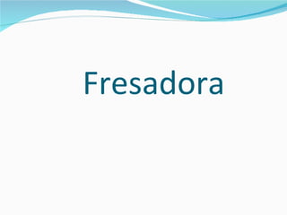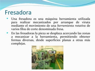 Una fresadora es una máquina herramienta que utiliza una fresa rotativa para mecanizar piezas mediante el arranque de viruta. Existen tres tipos de fresadoras: horizontales, verticales y universales, que se diferencian por la orientación del eje de giro de la herramienta. Las fresadoras constan de partes como la base, columna, consola, carro transversal y mesa, que permiten sujetar la pieza y desplazar la herramienta para realizar mecanizados.