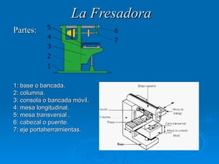 La fresadora es una máquina herramienta utilizada para mecanizado por arranque de virutas mediante el movimiento de una herramienta rotativa de varios filos de corte llamada fresa. Se compone de una base, columna, consola móvil, mesas longitudinal y transversal, cabezal y eje portaherramientas. Existe en varios tipos como vertical, horizontal, universal y CNC. Realiza operaciones como planeado, fresado en escuadra y ranurado usando movimientos de corte, avance y profundidad, formas de cort