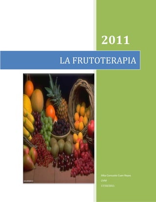 Este documento trata sobre la frutoterapia. Explica que la frutoterapia utiliza sustancias medicinales de las frutas para ayudar a metabolizar nutrientes y actuar en órganos afectados. Clasifica las frutas en dulces, ácidas, semiácidas y neutras e indica las propiedades y usos terapéuticos de frutas como el aguacate, la aceituna y la pera. También proporciona recomendaciones sobre el consumo de frutas y sus vitaminas, minerales y otros