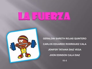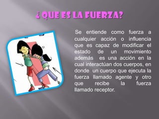 El documento define la fuerza como cualquier acción o influencia capaz de modificar el estado de movimiento de un cuerpo. Explica que la fuerza se mide en newtons en el sistema internacional y describe cómo se representan y clasifican las fuerzas. También cubre los efectos de las fuerzas como las deformaciones, cambios en la dirección y velocidad del movimiento, y menciona dinamómetros como instrumentos para medir fuerzas.