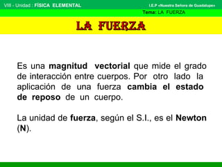 Este documento trata sobre la fuerza. Explica que la fuerza es una magnitud vectorial que mide la interacción entre cuerpos y que la aplicación de una fuerza cambia el estado de reposo de un cuerpo. También describe los tipos de fuerzas como la interacción por contacto, la interacción a distancia, las fuerzas gravitacionales, electromagnéticas y nucleares.