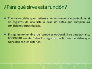 La función BDCONTAR en Excel cuenta el número de celdas en una columna de una base de datos que cumplen con ciertos criterios. Toma como argumentos la base de datos, el nombre de la columna a contar, y el rango que especifica los criterios. Por ejemplo, la función =BDCONTAR(A4:D9, "IDProducto", A1:A2) cuenta las filas en la base de datos A4:D9 donde el ID de producto es mayor a 25032, como se especifica en el rango A1:A2. BDCONTAR es útil para contar registros que c