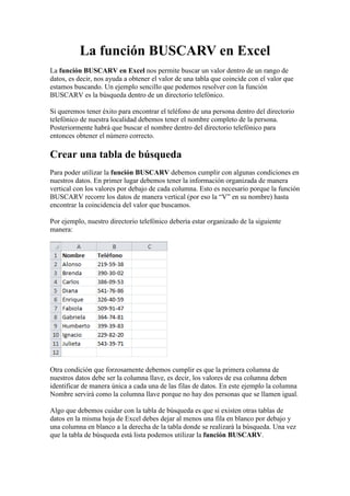 La función BUSCARV en Excel permite buscar un valor dentro de una tabla de datos y devolver el valor de otra columna correspondiente a la fila donde se encuentra la coincidencia. Para usarla, la tabla debe tener los datos organizados verticalmente y la primera columna debe contener valores únicos que identifiquen cada fila. La función BUSCARV tiene cuatro argumentos: el valor a buscar, la tabla de datos, el número de columna cuyo valor se desea obtener, y un valor lógico que indica si la búsqueda es exacta o aproximada.