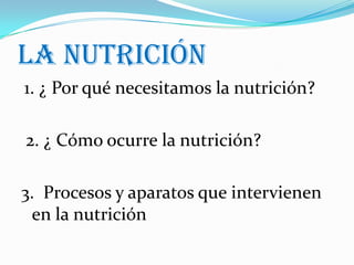 El documento trata sobre la nutrición y el proceso digestivo. Explica que la nutrición es necesaria para obtener energía y materiales para construir y reparar el cuerpo. Se describe cómo ocurre la nutrición a través de la ingesta de alimentos, que contienen nutrientes que son transformados y absorbidos. También detalla los cuatro procesos clave de la nutrición: digestión, respiración, circulación y excreción. Explica además el aparato digestivo y cada una de las etapas del proceso digestivo, desde la ingest