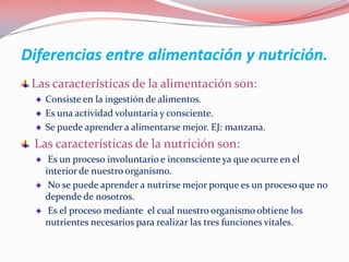 Este documento describe las diferencias entre la alimentación y la nutrición. La alimentación es el proceso voluntario de ingerir alimentos, mientras que la nutrición es el proceso involuntario por el cual el cuerpo obtiene nutrientes de los alimentos. También describe los principales nutrientes necesarios para el cuerpo, incluidos proteínas, lípidos, glúcidos, vitaminas, sales minerales y agua, y sus funciones energética, estructural y reguladora. Además, explica brevemente los sistemas digestivo, circulatorio y ex