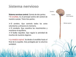 El documento resume los principales sistemas del cuerpo humano, incluyendo el sistema nervioso central compuesto por el encéfalo y la médula espinal, el sistema nervioso periférico formado por nervios sensitivos y motores, el aparato locomotor formado por huesos y músculos, y el sistema endocrino compuesto de glándulas que producen hormonas. Explica las funciones básicas de cada sistema y cómo trabajan juntos para controlar el cuerpo.